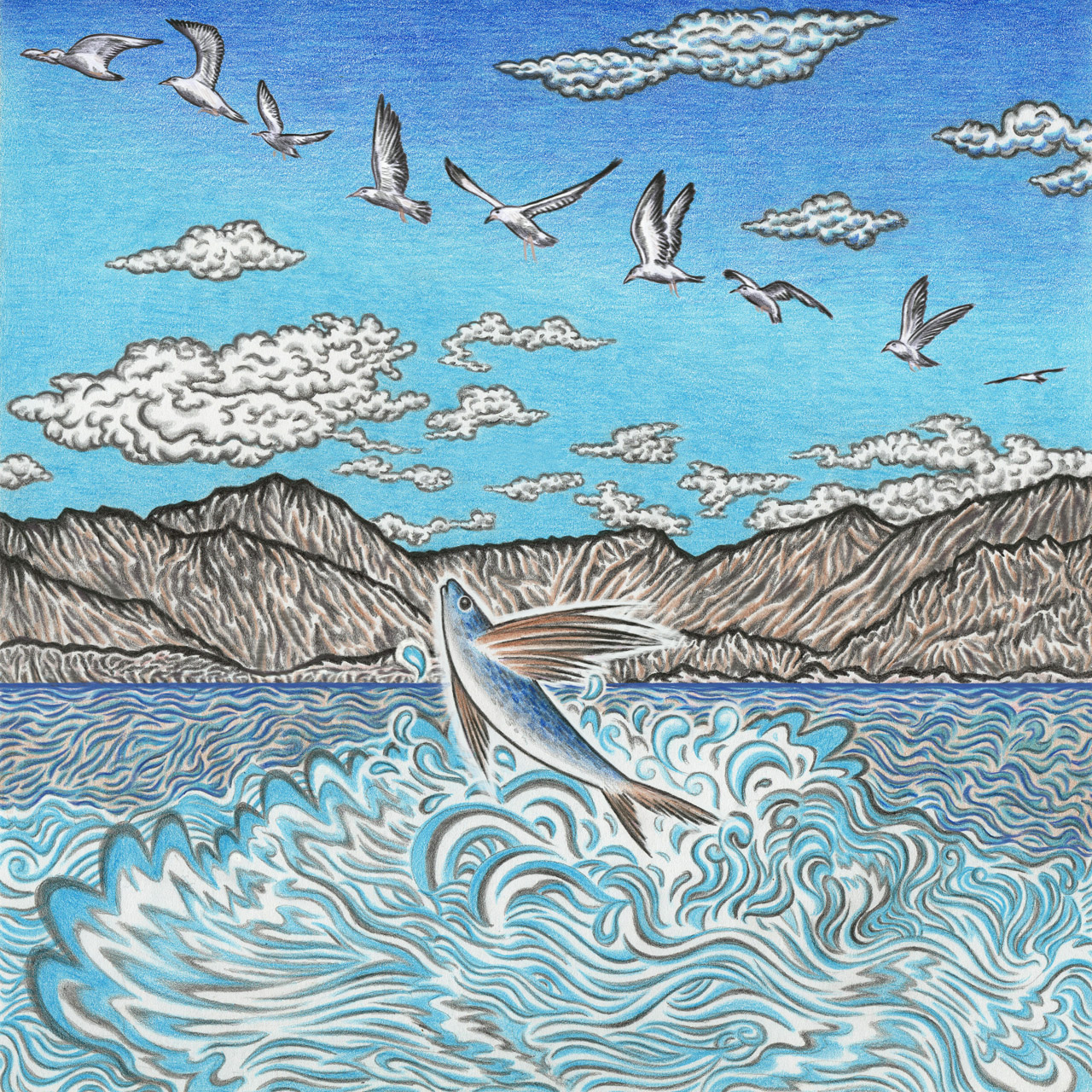 Un pesce volante balza fuori dalle acque del mare, spinto dal desiderio di librarsi in cielo e unirsi a uno stormo di gabbiani, convinto di essere uno di loro.
