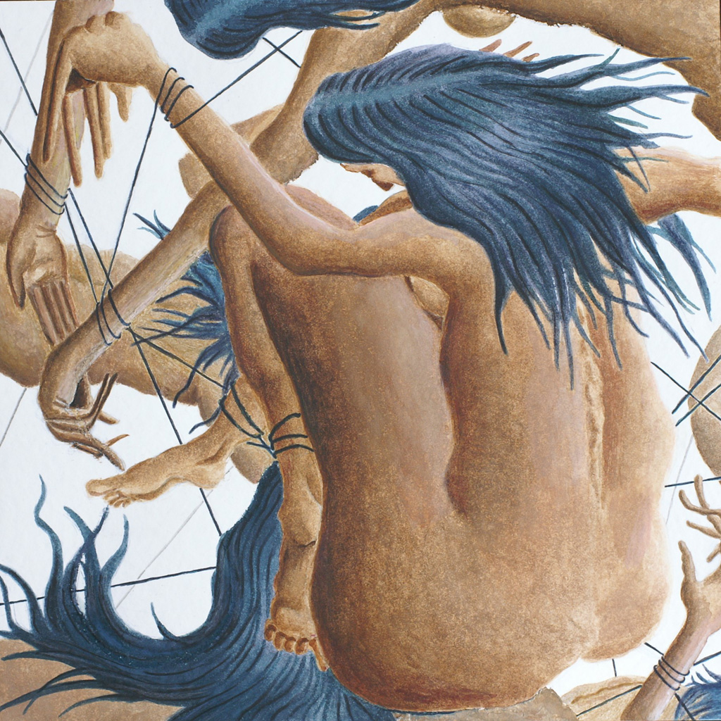 In questo caso più corpi sono legati tra loro in maniera totalmente caotica rendendo difficile distinguere a prima vista le membra di uno da quelle dell’altro e le corde concorrono a rendere ancora più complessa e aggrovigliata l’immagine.