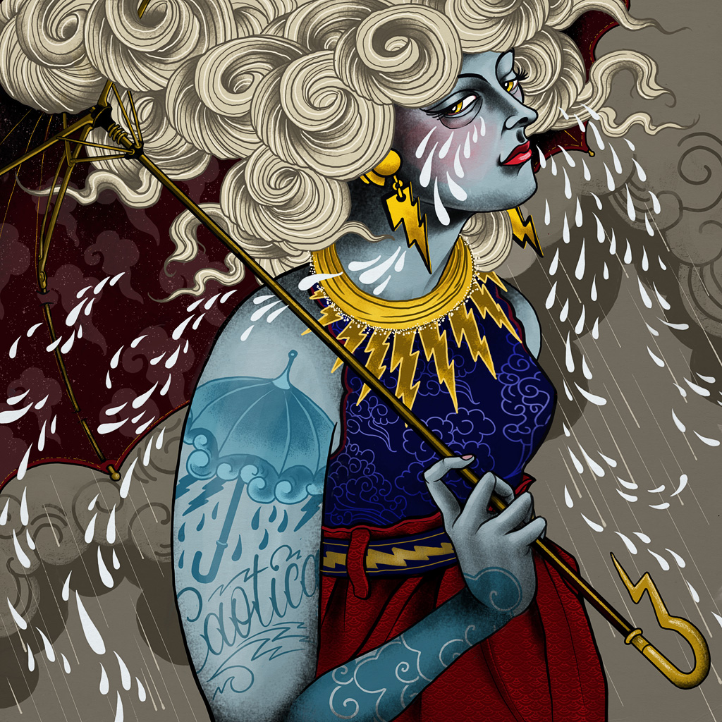 La semplice narrativa metaforica dell’immagine si spiega da sola. Ho saputo del concorso in un momento di rotolante stato mentale. Una serie di cambiamenti creativi, esistenziali e professionali mi ha vista ultimamente caotica e stralunata. Mentre riorganizzavo i pensieri in forme accettabili, ho pensato di approfittare del tema del contest per esorcizzare sentimenti condivisibili (e temi attuali sulla salute mentale) in questo Brain Storm dai fulmini d’oro. La Bellezza redime dalla tragedia. Difendiamo il caos perché contiene ispirazione, soluzione ed evoluzione, insegna la resilienza ed eleva la coscienza. Ispirata dalla perfezione di Erté, dalla meraviglia che mi assale quando entro in un negozio di tessuti, dall’iconografia semplicemente elegante e significante dei tatuaggi, dalle sublimi giornate di vento e temporale.