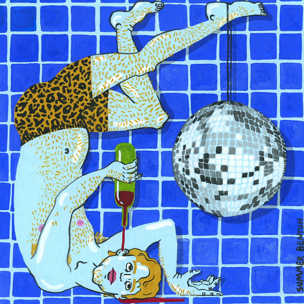 The first thing that came to my mind when I thought about the concept of chaos is the sense of chaos that I feel at a party. By this I mean both the literal chaos of lots of people interacting with each other and myself but also the chaos that occurs in my mind as I try to navigate the social situation. I tried to communicate some of this idea by painting my subject upside down, disoriented, and trying his best to maintain the fun, which is represented by the disco ball hanging by a thread.