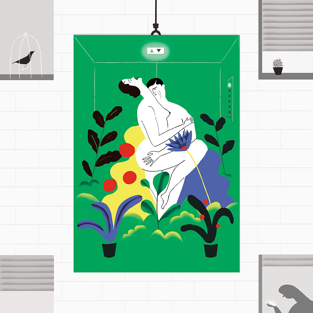 It’s an actual encounter between two lovers, going up on an elevator. This meeting happens before they get thrown out to the earthly external world.