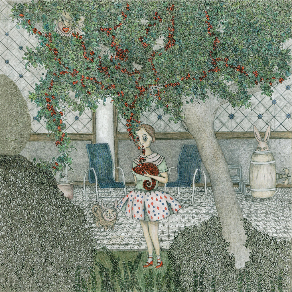 The image shows a girl within a secret garden , holding a chameleon. The chameleon s ability to get the attributes of the object it brought into contact with is expressed here to disclose the girl s secret emotions and unconfessable thoughts .