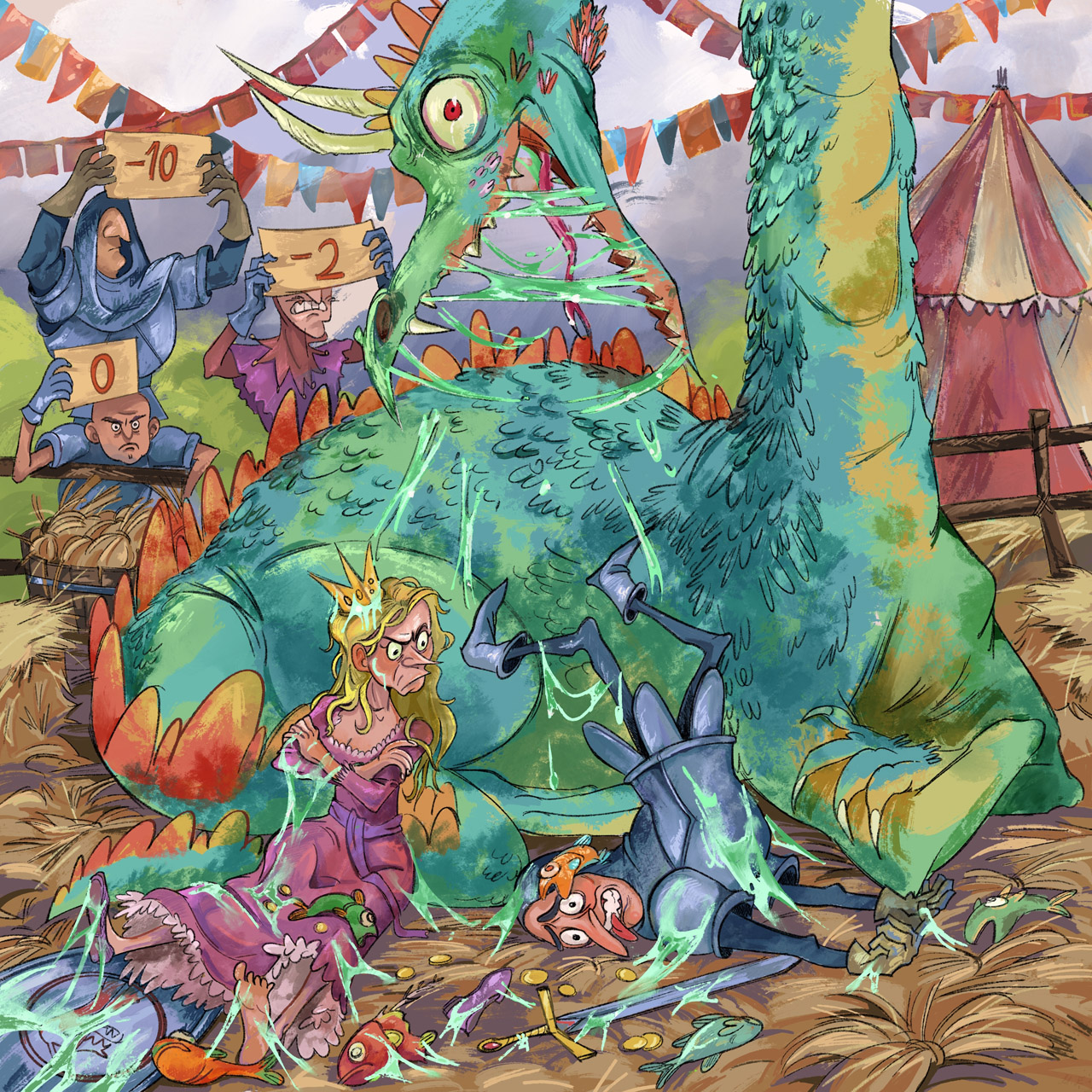 Ho scelto di interpretare il tema in un clima di fiera medievale, disegnando un cavaliere un po’ sventurato la cui performance di salvataggio non va come previsto…per nulla eroicamente.