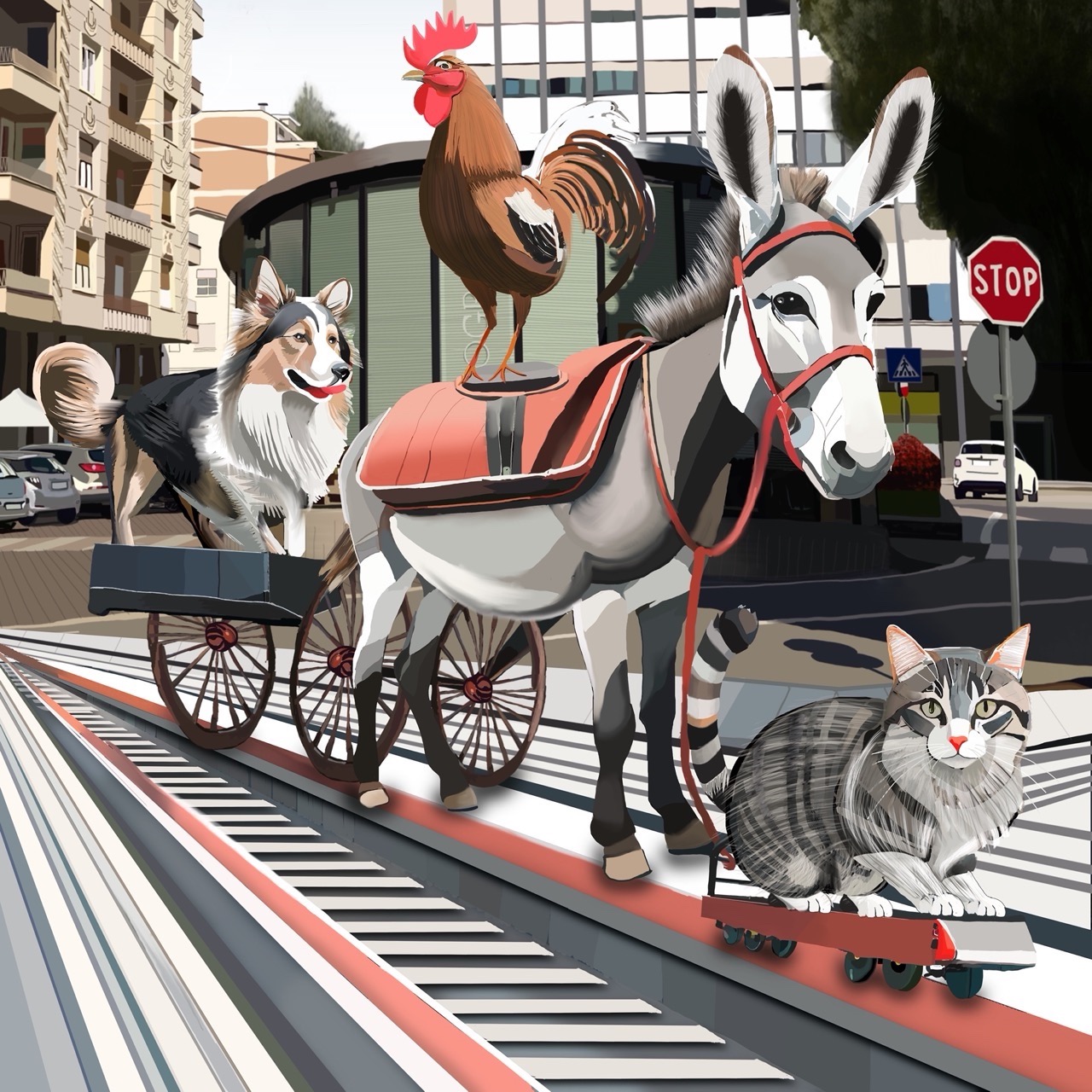 Ho attualizzato la fiaba dei fratelli Grimm dei musicanti di Brema. È descritto il momento in cui decidono di trasferirsi e abbracciare il loro sogno.