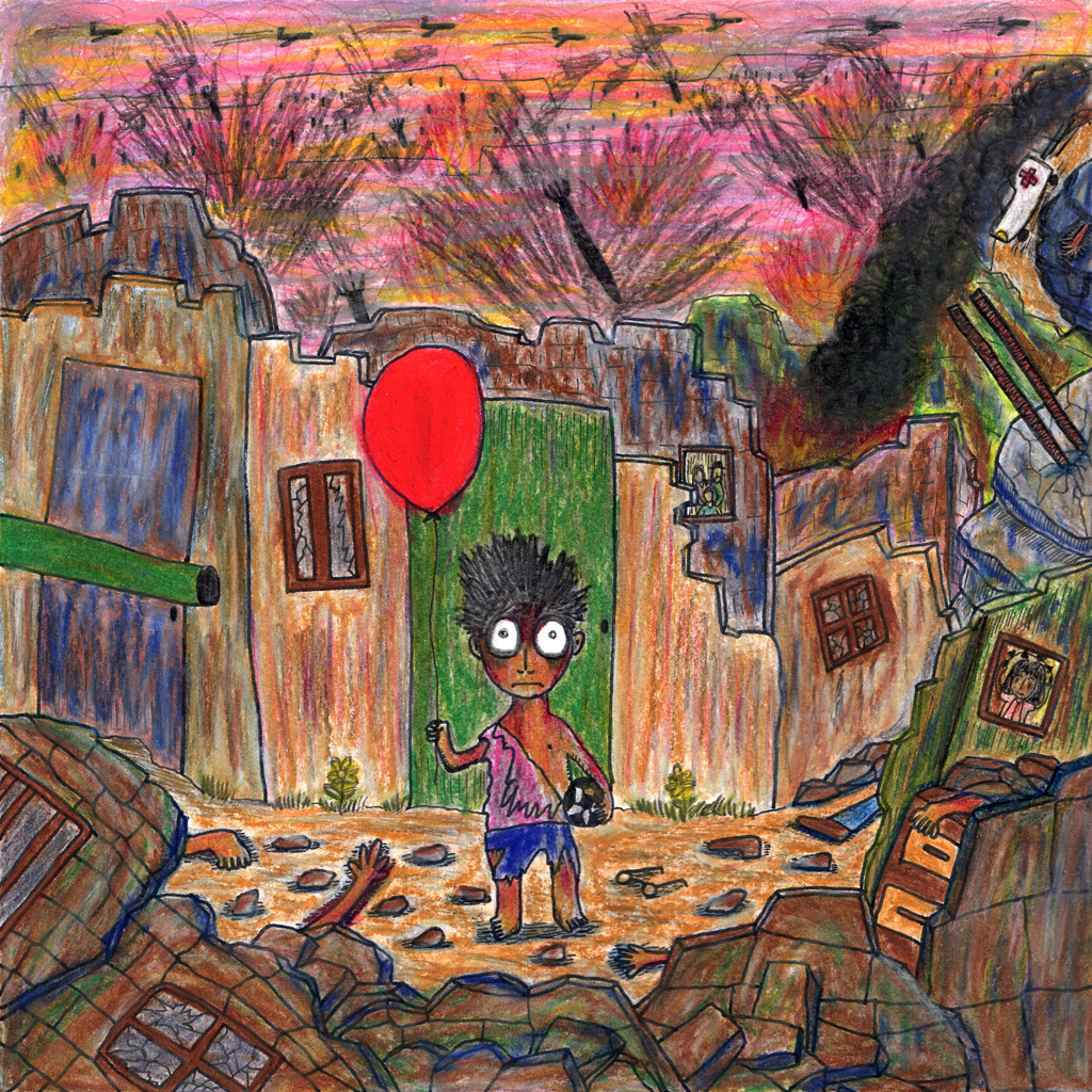 “What is chaos?” This is the first question that I asked myself when I decided to interpret the theme. I looked it up in the dictionary, it says: “A situation in which everything is confused and in a mess.” Then I started to think a chaotic situation: a messy working place, a crowded and noisy room, a state of disorder of transportation, a confusing thought, etc. But no matter what ideas of “chaos” came to my mind, I found them lacked something. Afterwards, I googled some illustrations interpreting chaos, and I saw many images with “crowded” scene. Immediately, I realised this kind of interpretation is not what I want. What I want is an influential image, an image that can make an impact on everyone, an image that can convey my feelings and express my opinions about the world. This was how I decided to focus on war since I am against it. “What could be more chaotic than a war? What could be more confusing and messier?”