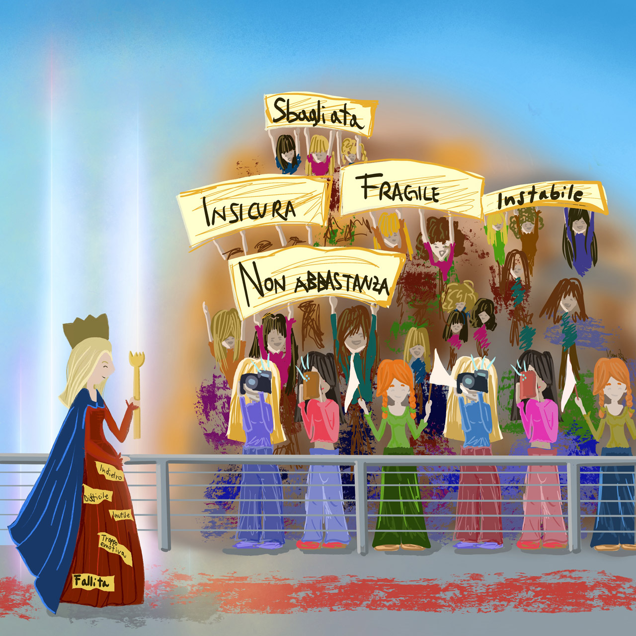 Una donna viene incoronata non per il suo successo, ma per le parole che le vengono imposte: “fragile”, “insicura”, “non abbastanza”, “fallita”, “troppo emotiva”.