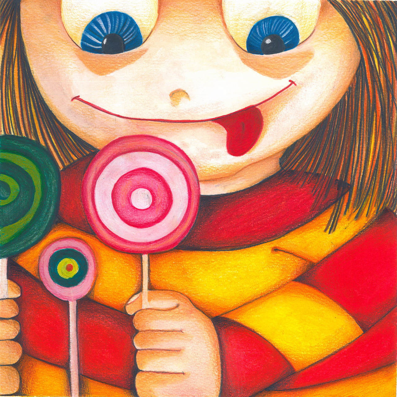 La forza del colore e la simpatia trasmessa dalla golosità della bambina attirano particolarmente l’attenzione su questo disegno.