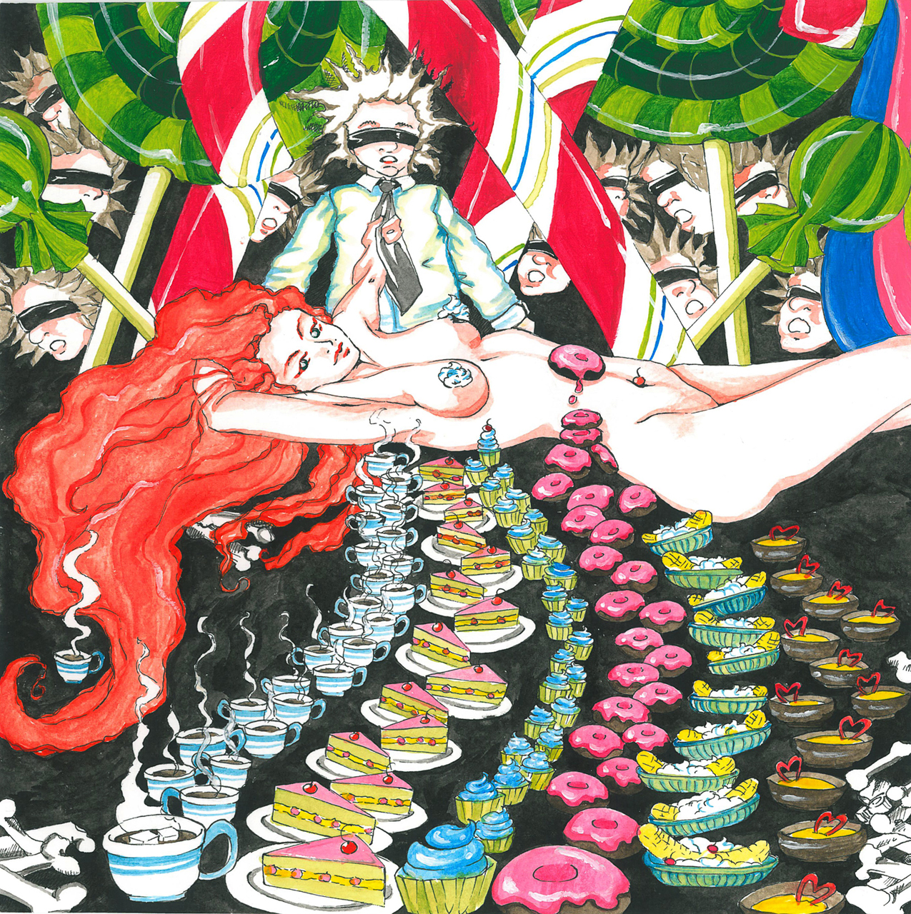 il mio buffet racconta una storia in cui degli invitati sono tratti in inganno da abbondanti tentazioni.