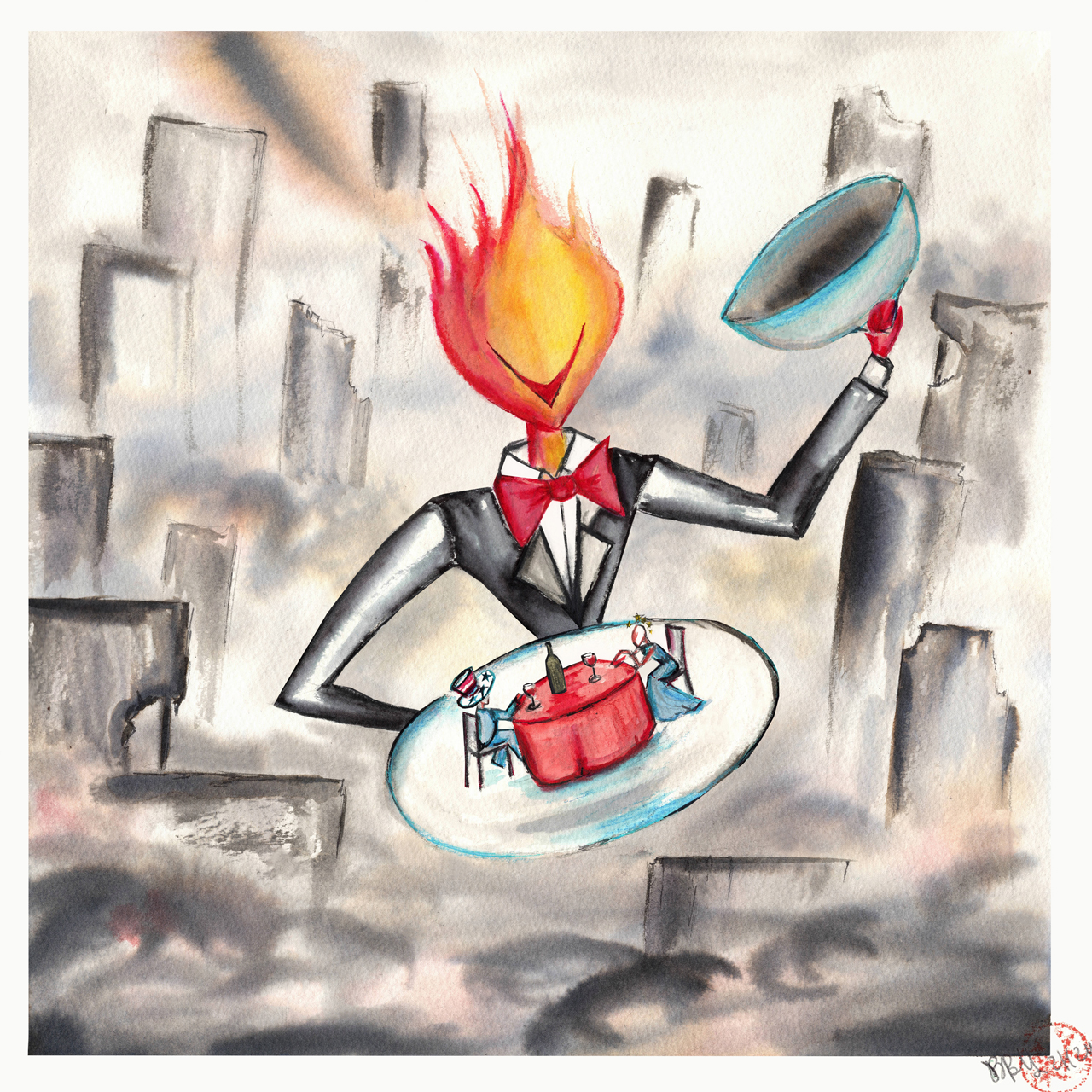 Voilà e il piatto è servito: un uomo e una donna che cenano tranquillamente con un bicchiere di vino. Il contorno è tutto quello che non viene mostrato: guerra e distruzione.