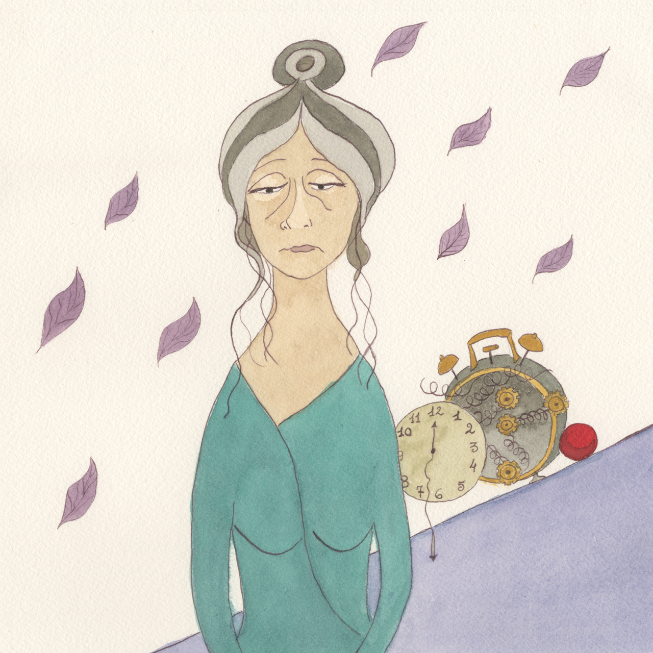Il disegno rende nell’utilizzo dei colori e delle immagine i concetti interpretativi. La sveglia non segna più il tempo; il piano è inclinato. Non c’è molto tempo per riprendere ad amare. Ma ce n’è. -