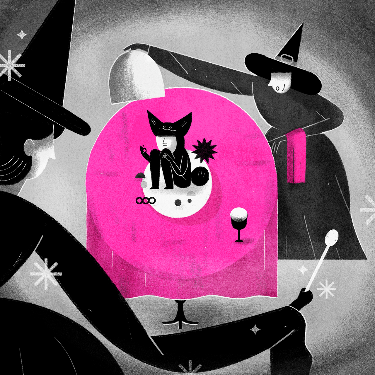 Voilá! Welcom to the Midnight Banquet. Your dinner is ready and served. The artwork reflects the theme of “voilá,” which suggests a sudden and surprising revelation. In this case, the revelation is the witches’ unexpected gourmet meal. The overall tone is dark and magical, with a touch of humor. The witches’ expressions and the bizarre nature of the “food” contribute to the comedic element.