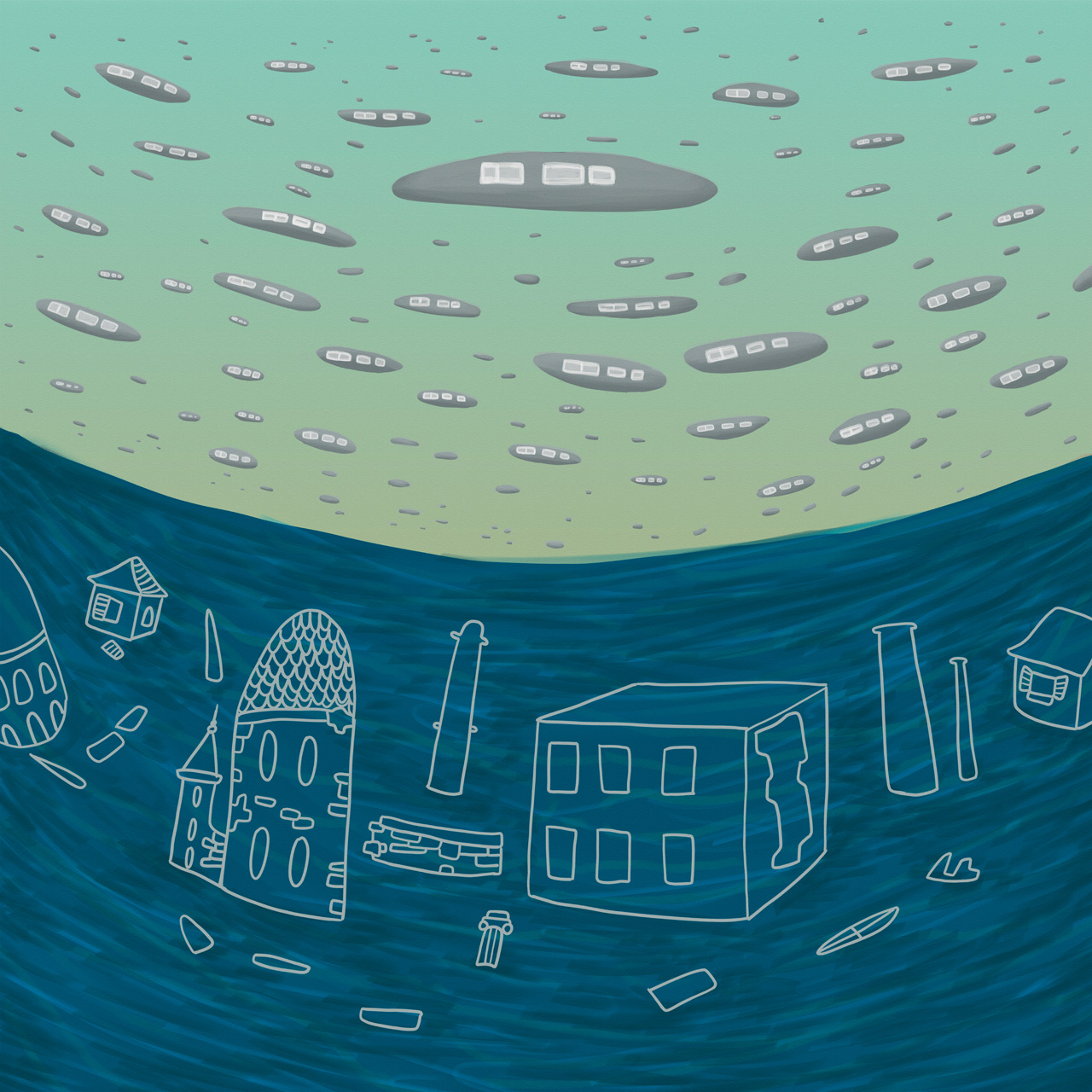 Ho immaginato una civiltà in rovina che distrusse la sua stessa casa e che all’incombere dell’innalzamento delle correnti oceaniche, da loro stessi causato, si riunì in delle rocce di metallo fluttuanti