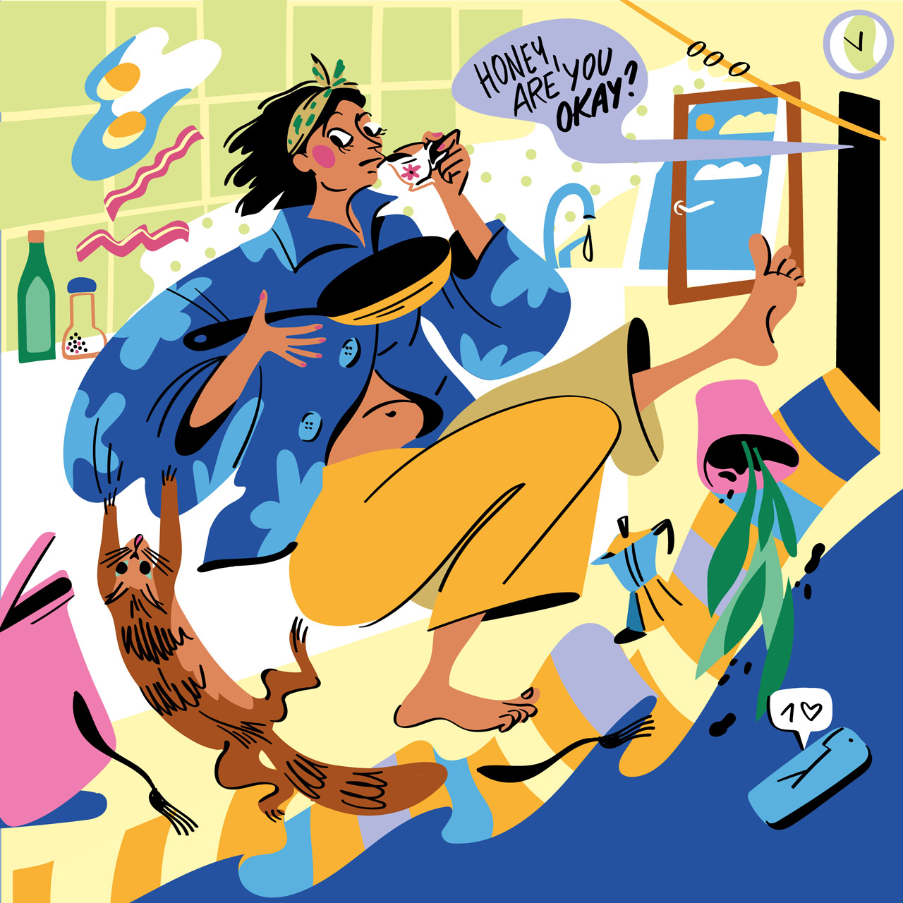 Semi autobiographical illustration, to which, I believe, we all can relate – we’ve all had that morning when the things went flying and the breakfast was a flop in one way or another. Some mornings are just like this yet it’s important to keep perspective and not let it spoil the entire day.