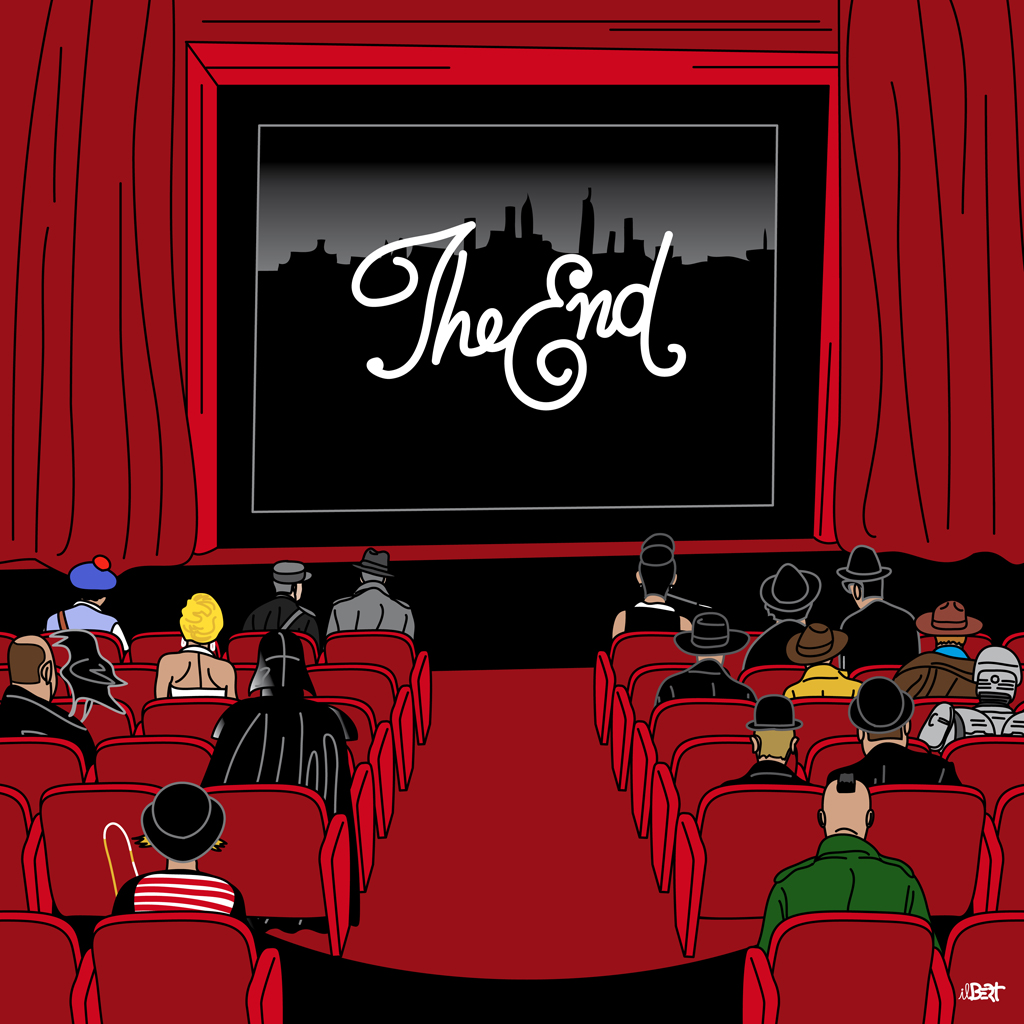 Ho deciso di reinterpretare la scena finale di tutti i film: IL THE END dei titoli di coda. Xchè rappresenta anche un nuovo inizio (il prossimo film che verrà). E ho raccolto in platea alcuni dei personaggi cinematografici più significati per il cinema è talmente ricco di diverse emozioni che molti film rientrano tra i preferiti.