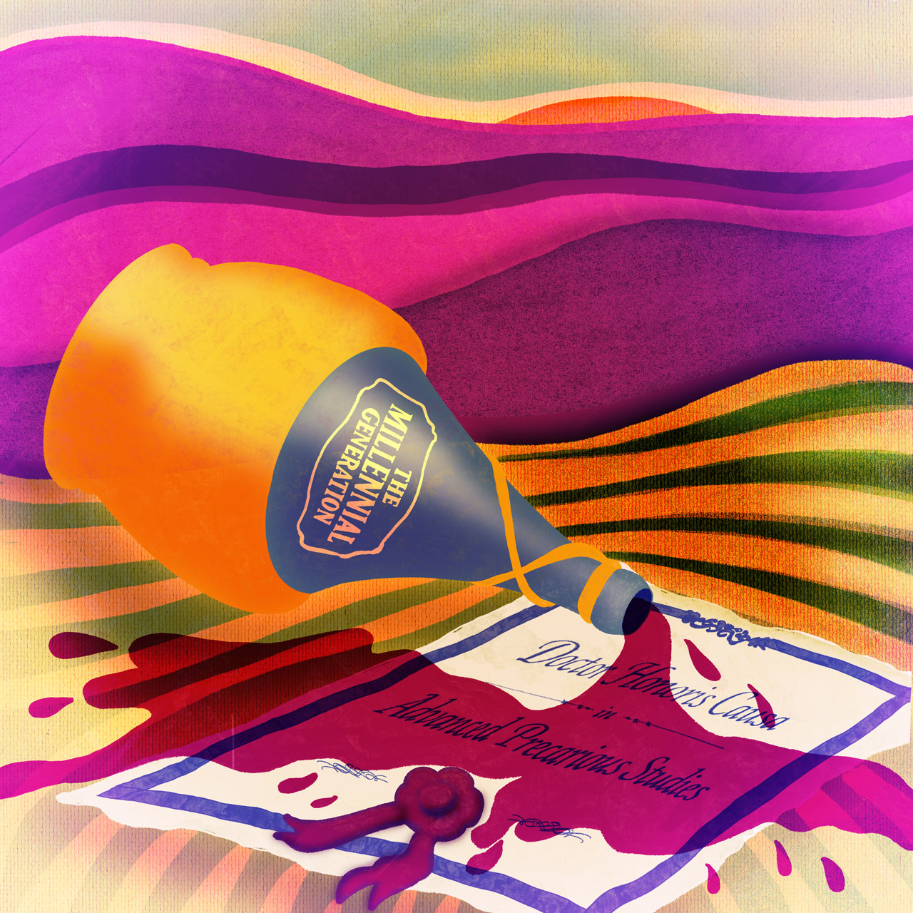 Un’illustrazione concettuale che trasforma un tradizionale fiasco di vino italiano in metafora della generazione millennial: un’annata di qualità, costantemente aggiornata e qualificata, ma che spesso si trova comunque a fare fiasco.