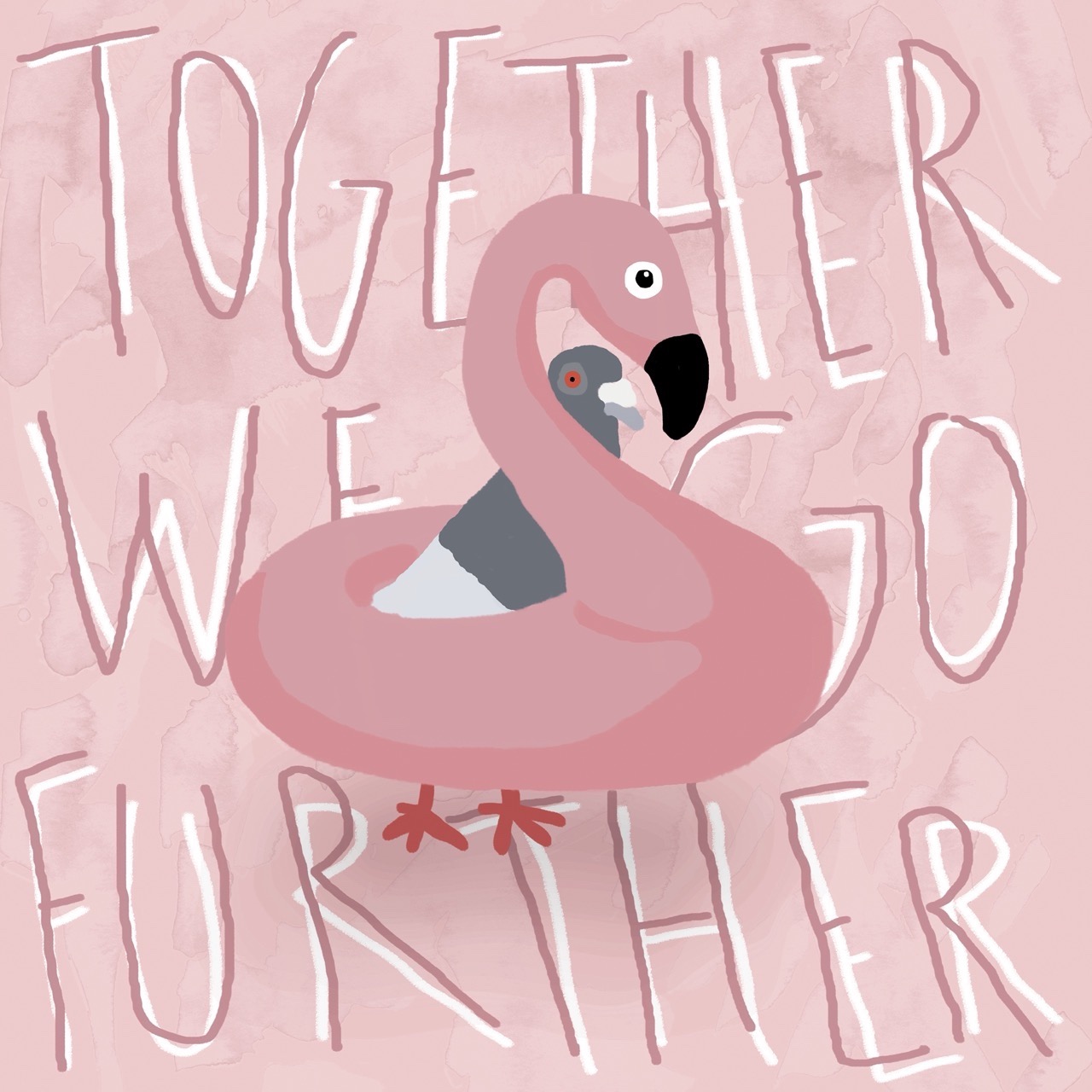 Questa illustrazione mostra una storia di solidarietà tra un piccione che non sa nuotare e un fenicottero, gonfiabile, che invece non può volare né camminare. Insieme si va più lontano quando si impara che lo spirito di collaborazione è il miglior modo per superare le difficoltà, proprio come pedalare insieme.