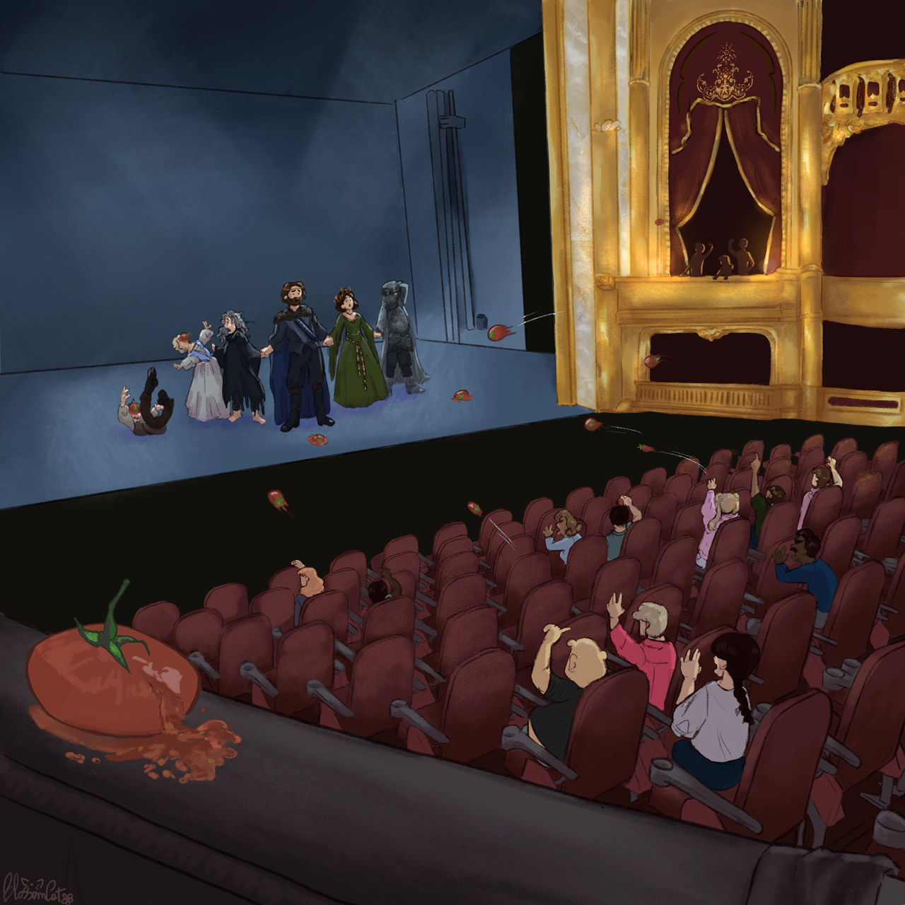 L’opera rappresenta un gruppo teatrale dopo la fine della loro esibizione di Macbeth e il pubblico scontento lancia i pomodori.…