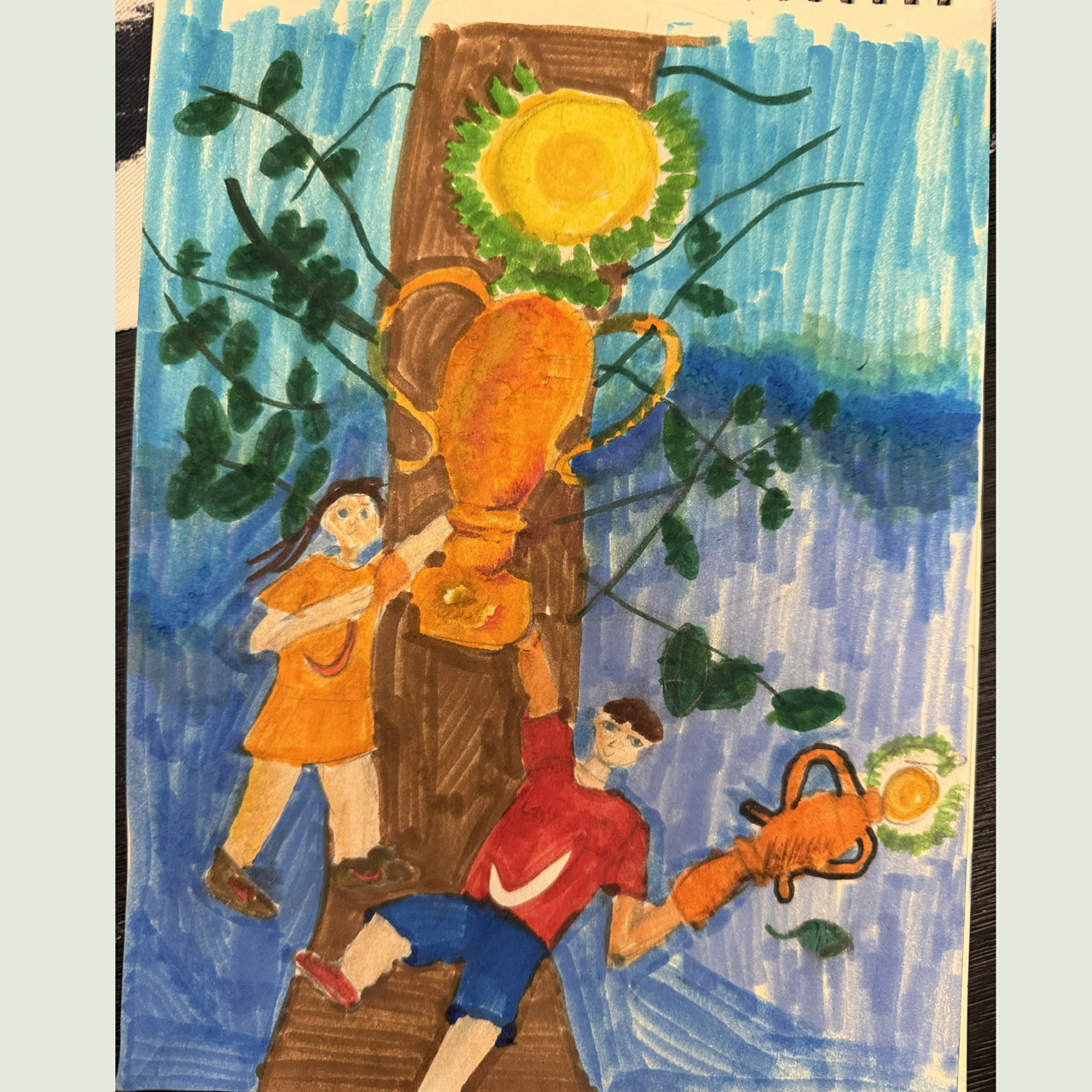 This drawing tells the story of two children climbing a tall tree to reach a shining golden trophy at the…