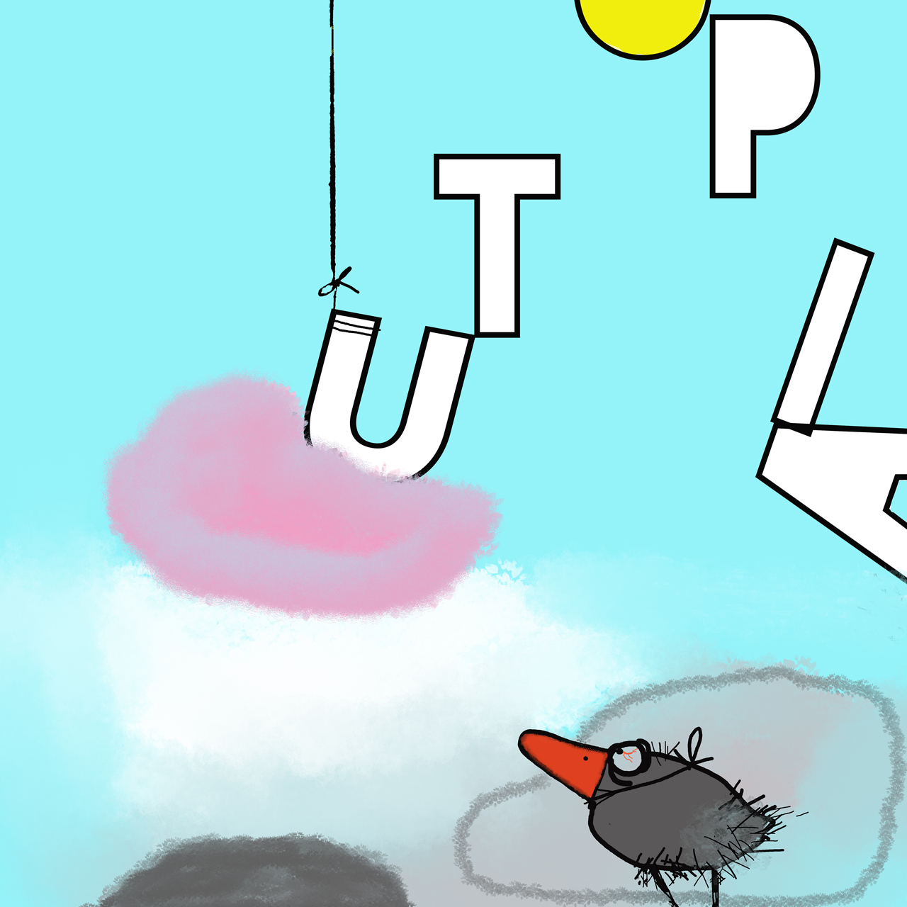 An apparent, beat up bird with a fake beak attached by a string stares puzzled at the letter ”U” of…