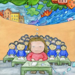 Ho voluto immaginare come una bambina può vivere il caos, da una parte nell’allineamento , l’omogeneità che la circonda ,…