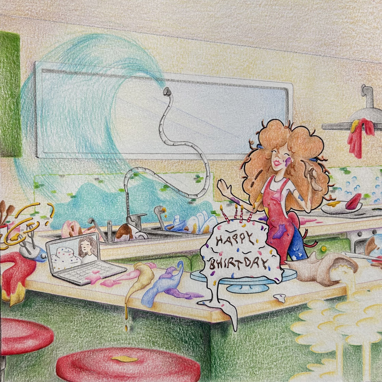 Volevo rappresentare un flop divertente, la ragazza felice di aver finalmente terminato la sua opera d’arte se così possiamo chiamarla,…
