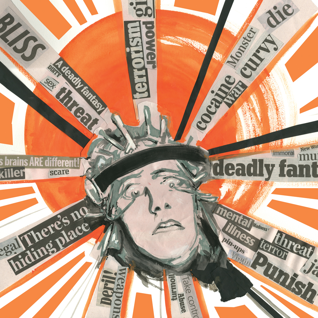 I have chosen to illustrate one of the most iconic scenes from Stanley Kubrick’s ‘A Clockwork Orange’. In this scene, the title character Alex, is subjected to experimental treatment to cure him of being ‘bad’ or ‘evil’. His eyes are forced open and he is made to watch vile images at the same time as feeling sick, in order to associate that feeling with evil. I found this scene to be particularly compelling when I watched the film for the first time, as I struggled to decide who was good and who was evil in the scene, as the film constantly forces the viewer to do so, as Alex is clearly in a great amount of suffering. I chose to illustrate this scene using collaged clippings from newspapers to highlight the fact that evil is something real in our world, and that although we try to avoid it, we must all make our own choices about what we come into contact with and the decisions we make in life. I also stuck to a relatively small colour scheme using mainly black and grey with only the bright pop of the orange, to allude to the film’s title.