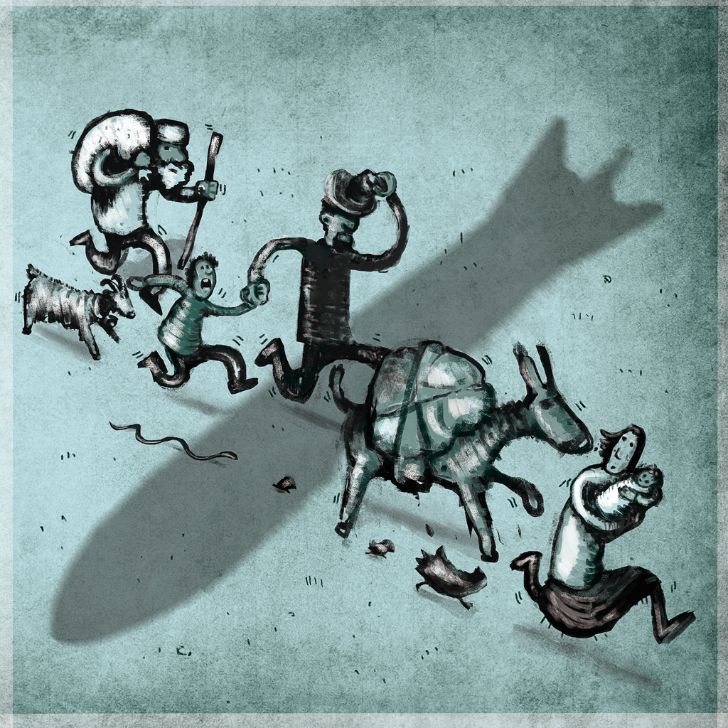 Un’ illustrazione ironica a ricordare chi è costretto a scappare in direzione opposta a quella dello “sviluppo econimico”.