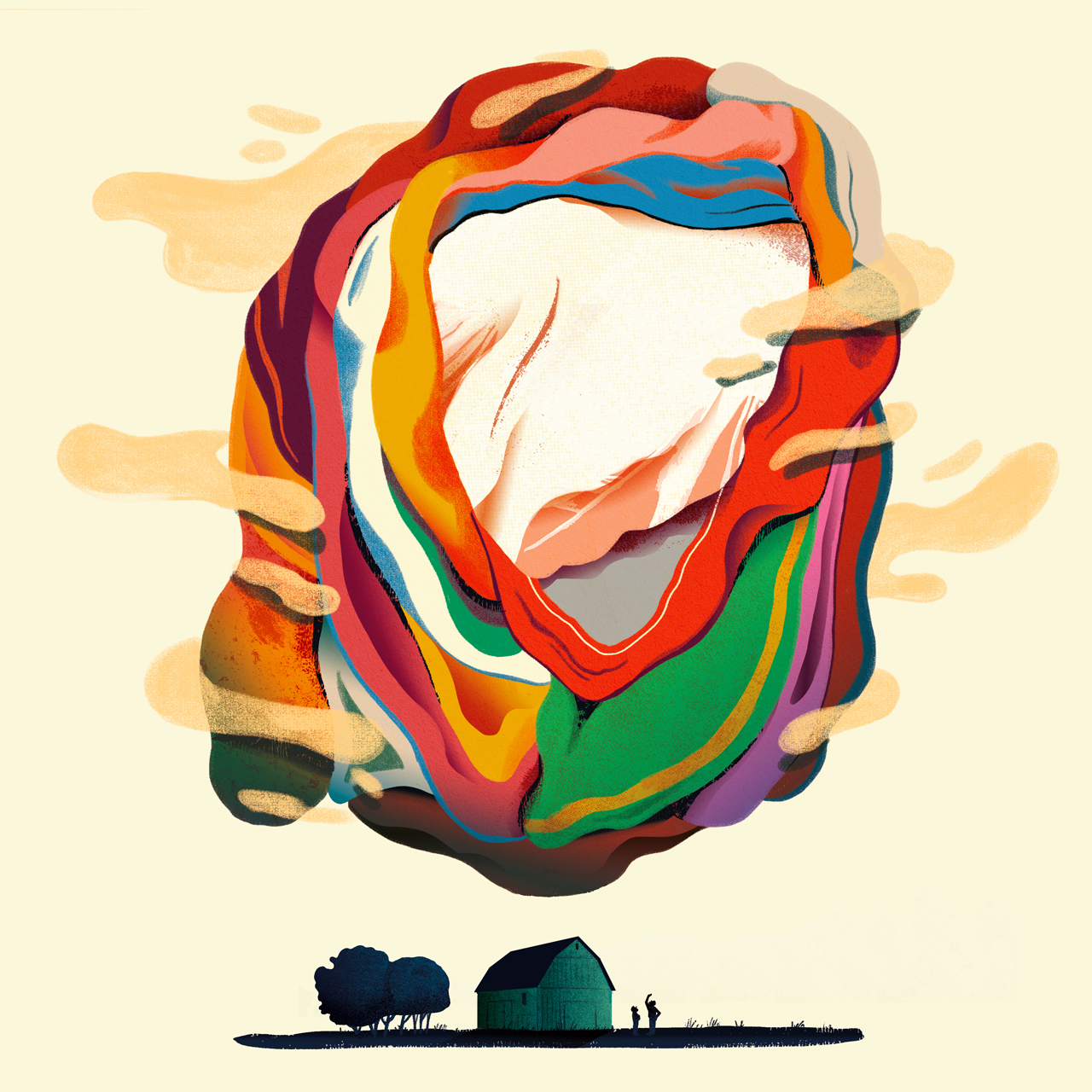 Voilà! An apparition of a floating giant, of a thousand colors, contrasts and soft forms as of fabric undulating in the wind, silent and with slow movements that levitates above the country house of a couple that goes out to admire such a grandiose spectacle. What can happen next…voilà!