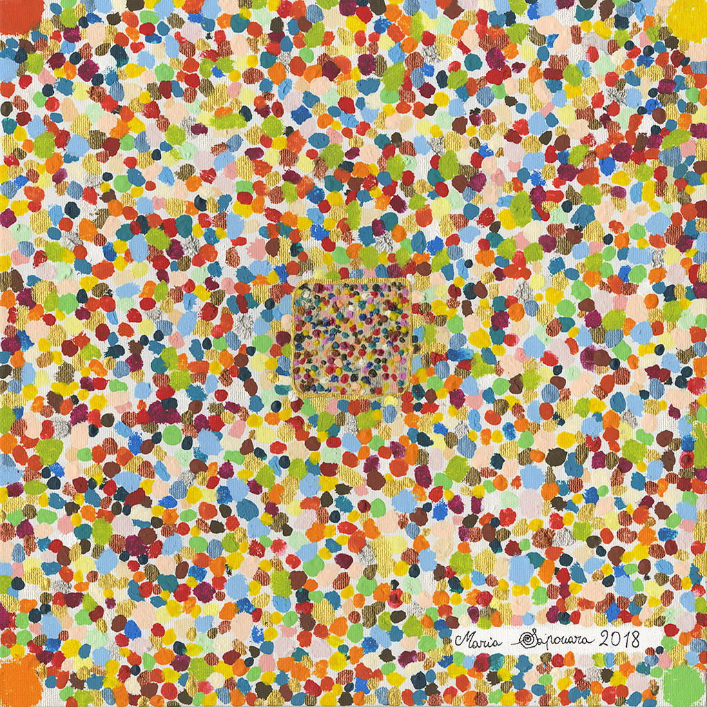 Il CAOS rappresentato da me con una miriade di colori come i filosofi con la “visione ciclica del mondo” e il caos primitivo, a cui si rifà Eraclito, il pitagorismo, Anassimandro, Empedocle, gli scettici, Democrito con il movimento caotico di atomi, del quale parla Dante con “il mondo a caso pone”. Il mondo di Heidegger come “totalità di rimandi e significati”. Kant parla di molteplicità caotica, invece Freud parla di Es come forza caotica, inconscio.