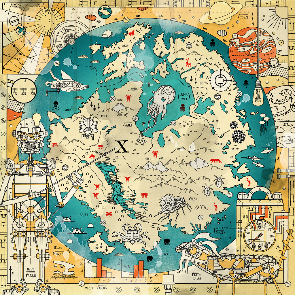 Terra Incognita is a motif which has been constructed from technical and scientific drawings taken from an enormous number of academic textbooks. The Collage is influenced by various authors like Jules Vernes, H.G. Wells or Jonathan Swift and combines the elements from adventure and sci-fi stories of my childhood.