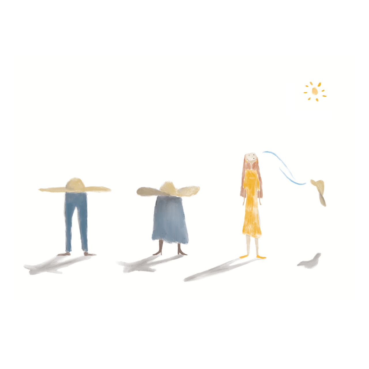 C’era una volta una famiglia che aveva paura di tutto ed utilizzava enormi cappelli smisurati per potersi proteggere, erano così tanto coperti che quasi sparivano. Una folata di vento un giorno fece volare un cappello e voilà..il sole! Da allora, vissero senza paura e liberi sotto il cielo splendente.