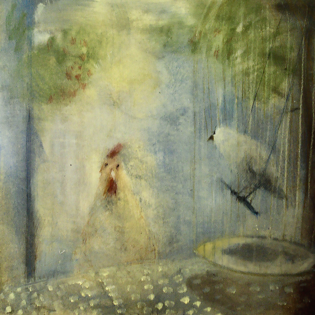 gallina ignara del proprio destino saluta compassionevole l’amico in gabbia.